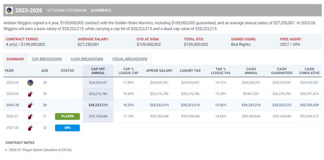 维金斯是2023年夏与勇士续约四年1.09亿,下赛季2822万,26-27赛季3016万,上赛季维金斯场均18分4.5篮板2.6助攻1抢断0.83盖帽,命中率44.8%,三分命中率37.3%。